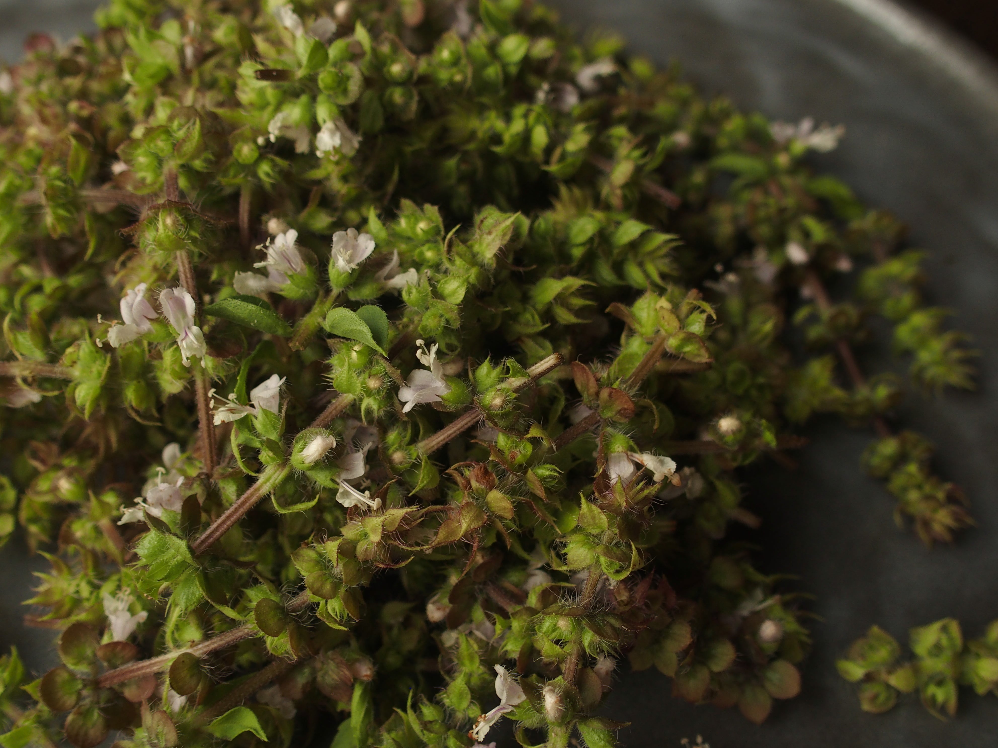 レモンバジルが持つ香りを生かすために、当園では花および若い穂先のみを原料に用います(写真には茎がついているものもありますが、こちらも全て取り除きます)。部位としては全体の5%程度となり、大量につくることはできません。